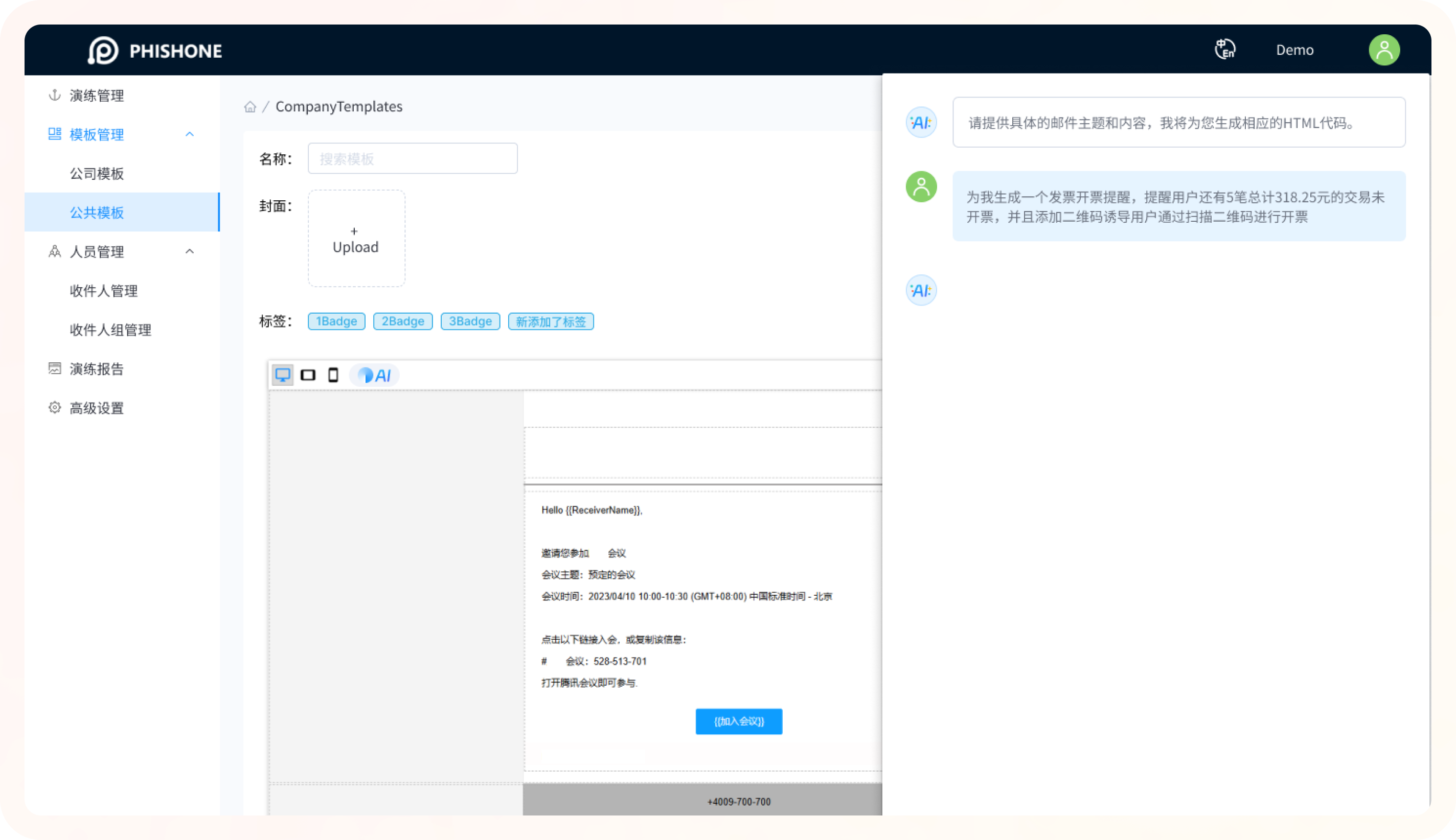 输入一句话即可生成完整钓鱼邮件,快速扩充模板库。