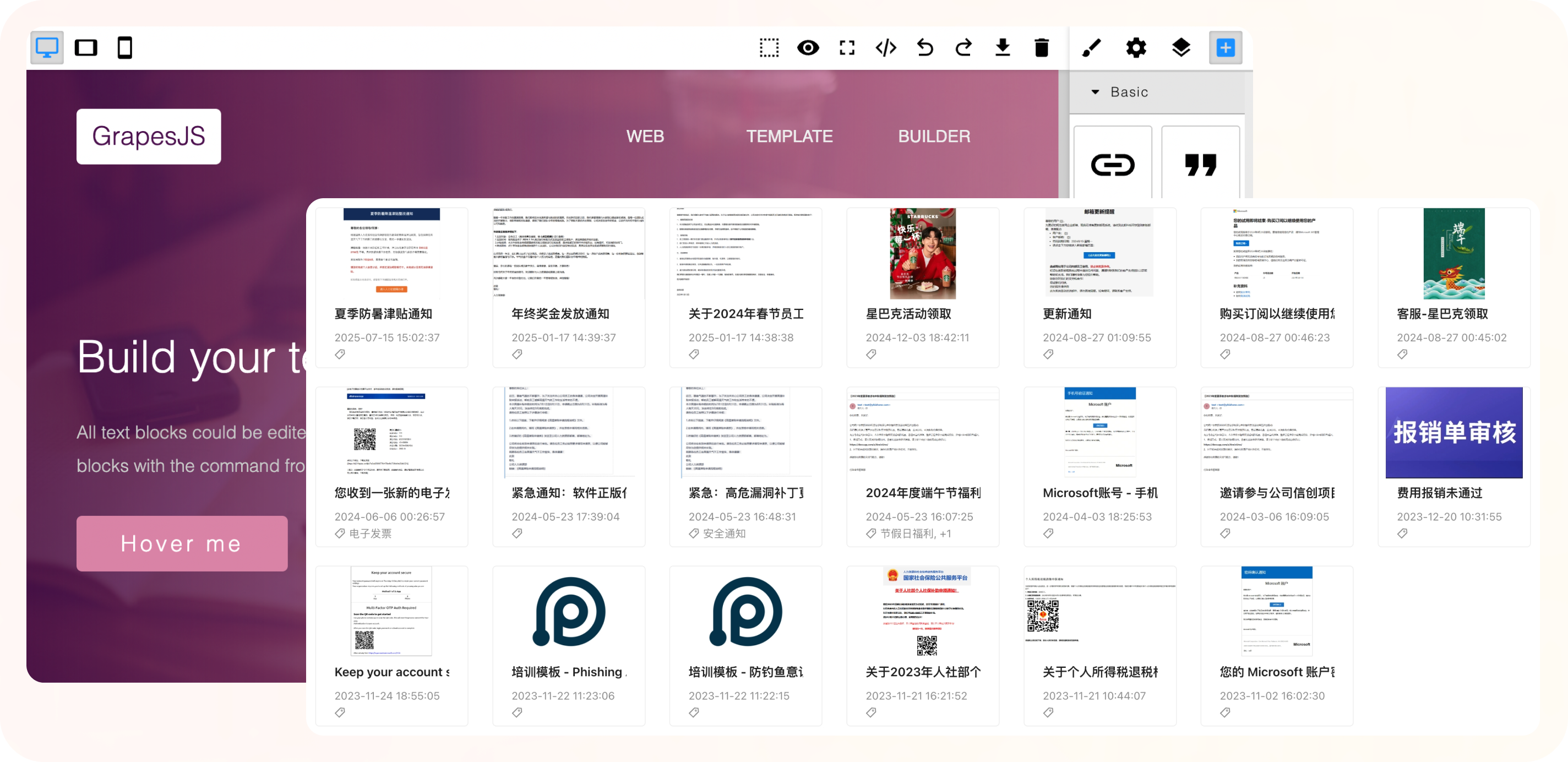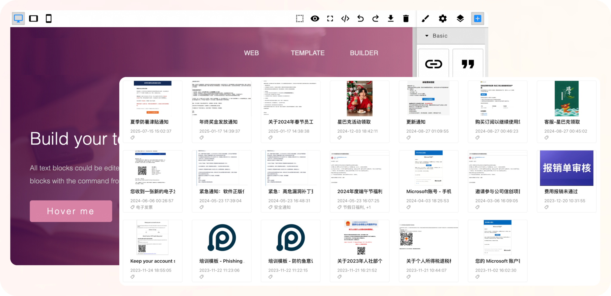 模拟演练编辑界面支持对已选择模板的自定义编辑,支持模块拖拽,无需技术代码即可编辑,兼容多个客户端及邮件服务器。